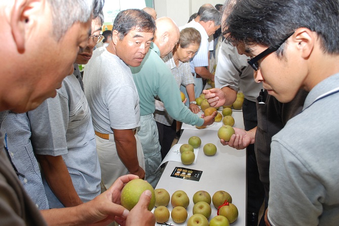 査定会では、生産者が持ち寄った梨で等級をつけ、形状や大きさ、色回りなどを確認し意志統一を図りました。市場関係者は「出荷の際は、色回りに気をつけてください」と呼びかけました。