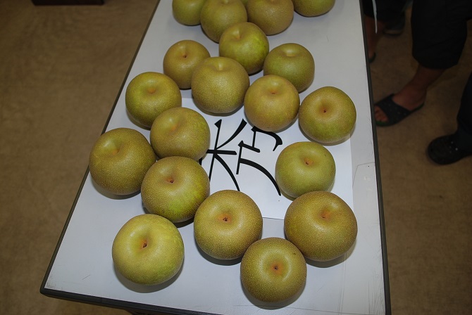 一宮・岬梨組合は7月22日、平成26年産の「ながいき梨幸水査定会」を開きました。生産者、市場担当者ら約80人が出席しました。