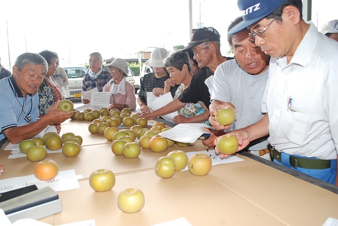 生産者が持ち寄った梨を「秀」「優」「良」に分類し、収穫・出荷の際の注意点、カラーチャートで色回りの確認しました。関係者は「色回りに気を付け、適期収穫と計画出荷をお願いしたい」と呼びかけました。