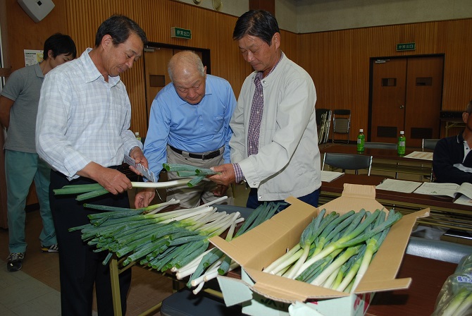 JA長生本納蔬菜部ミニねぎ部会は、買い物袋から出ないサイズで使いやすいミニネギを、東京・日本橋のデパートで販売します。 同部会は本納支所でミニネギの査定会を開きました。生産者、市場担当者や約30人が出席しました。 今年産は、台風の影響で冠水や倒状したほ場が若干見られ、例年より生育が遅れ気味。11月下旬までに、5000㌜(1㌜60本)の出荷を見込んでいます。 査定会は、出荷計画、規格を確認し現品査定を行いました。