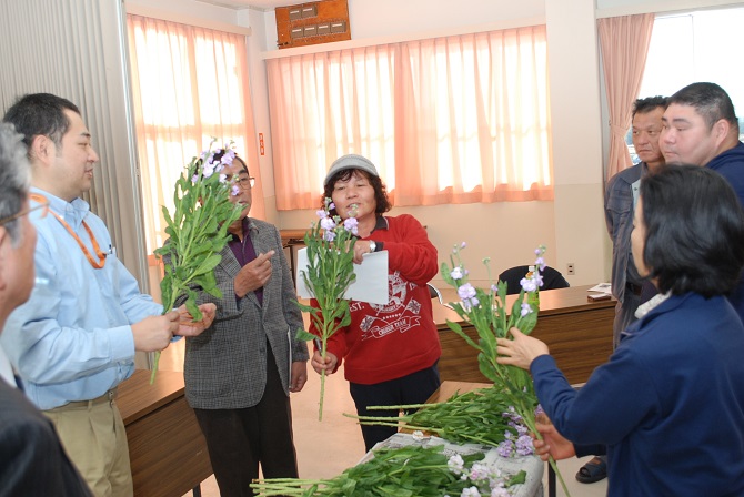 ながいき花倶楽部はスプレーストックの本格出荷の前の12月8日、高根支所で査定会を開き、生産者や指定市場関係者などが参加しました。