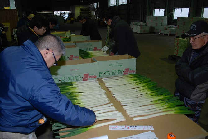JA長生は2月5日、JA長生本納支所で「長生ねぎ(秋冬ねぎ」の共進会を開き、行政、市場関係者などが参加しました。同管内の3地区の秋冬ねぎ(2L級)43点が出展され、厳正な審査の結果、中田成一さんが最優秀賞に輝きました。 審査は軟白のバランス、根の切り方、つや、葉の色などを審査し、1次審査で10点に絞り、2次審査では出荷箱から取り出し、1本1本確認しました。審査員は「どの品も良く甲乙付け難かった。毎年レベルが上がってきている」と講評しました。