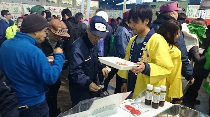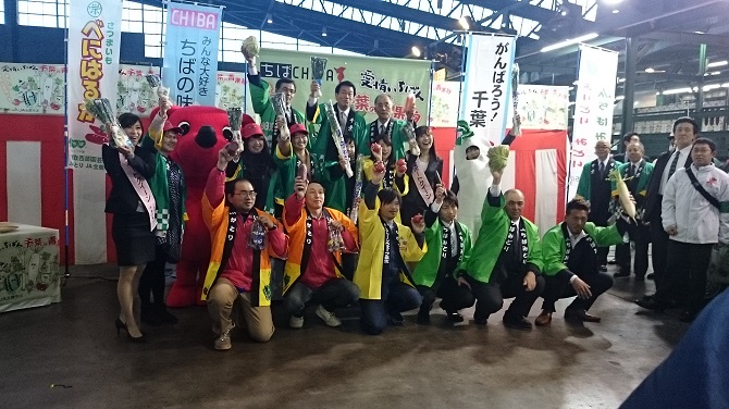 このほど東京都中央卸売市場太田市場で、千葉県産春野菜が旬を迎えるにあたり「千葉の産地大集合!若さで挑む千葉県野菜春の陣」が開催されました。 県内若手生産者、JA役職員、千葉県知事も来場し、市場関係者に千葉県の品目の多彩さと品質の高さ、更には新鮮さを全面に押し出したトップセールスが行われました。 JA長生からも、JA長生施設野菜部会青年部より石和田青年部長と河野さんがトップセールスに加わり、味、品質の高さだけでなく、安全・安心な長生トマトをPRしました。