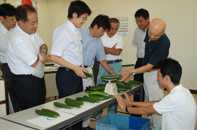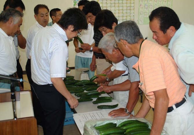 JA長生施設野菜部会抑制キュウリ部は出荷に合わせ、9月14日、JAグリーンウェーブ長生で2012年産「抑制キュウリ」の査定会を開催しました。生産者、県農業事務所、指定市場担当者ら30人が出席しました。