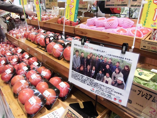 JA長生施設野菜部会青年部は3月22日に、指定市場5社の取引先量販店6店舗で「長生(ながいき)トマト」の試食販売キャンペーンを実施しました。キャンペーンでは若手生産者たちが自ら店頭に立って長生トマトの魅力をPRしました。また今年より新たに取り組みを開始した「プレミアム長生とまと」の販売も行いました。 これから出荷最盛期を迎える長生トマトは「色良し、味良し、鮮度良し」をモットーに、常に高い品質を目指しています。