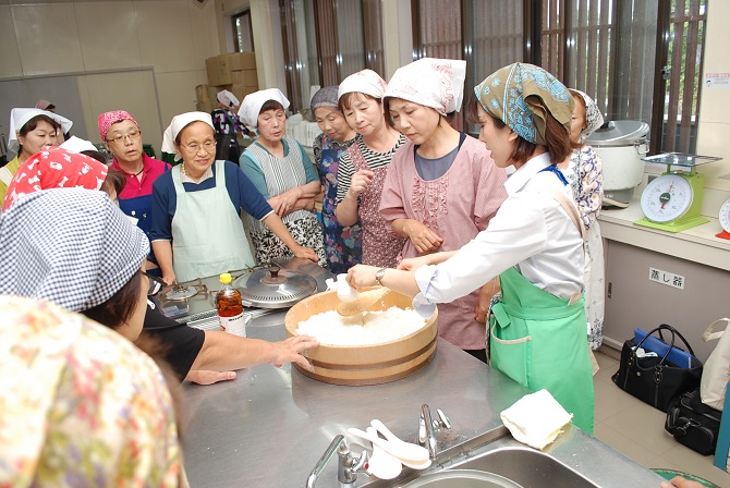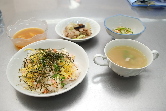 女性部短期大学校第3講座の酢の講習会が6月18日、白子町健康づくりセンターで行われました。 大興産業(株)の佃 生恵さんを講師に「鮭と長いものちらし寿司」「豚肉となすの粒マスタード炒め」「きゅうりとみょうがのピリ辛和え」「とうもろこしのスープ」「オレンジ紅茶のゼリー」の5品を作りました。それぞれの料理に酢が使われ、とてもおいしくできました。 試食した短大生は「おいしかった。さっそく今晩のおかずに作ります。酢はいろいろな料理に使えるんですね」と話しました。
