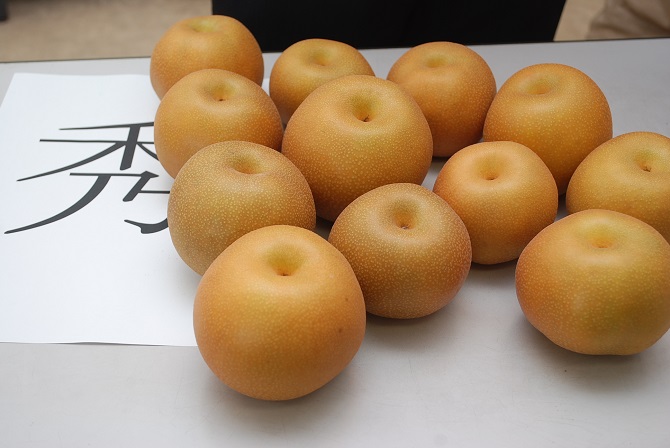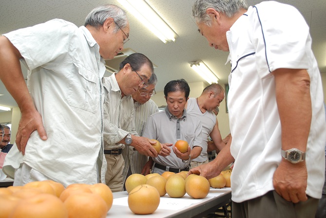 一宮・岬梨組合は、21日に「豊水」の初出荷を迎え、26日からは「二十世紀」の出荷が始まります。 出荷直前の19日に、グリーンウェーブ長生で生産者、市場担当者ら約80人が参加して「豊水」・「二十世紀」」の査定会を開きました。生産者が持ち寄った梨を規格ごとに分け、色回りや大きさ、糖度を測り規格の統一を図りました。 9月中旬までに「豊水」は1万9000㌜(1㌜10㌔)、「二十世紀」は1600㌜(1㌜5㌔)の出荷を見込んでいます。