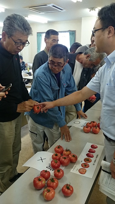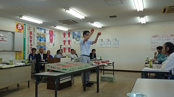 他産地の情勢報告や販売方針、出荷留意点などを確認し、現品研修も行われ、大きさ・着色・裂果などの出荷規格と品質を生産者らは現物を手に取りながら再確認しました。市場関係者は「長生はファンが多いので、『色よし・味よし・鮮度よし』の長生の規格をしっかりと守って出荷をお願いしたい」と注意を呼びかけ規格・品質の統一を図りました。