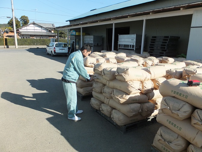JA長生は12月9日、長南東部営農組合で大豆の初検査を行い、JA農産物検査員は393袋(1袋30㌔)を検査しました。