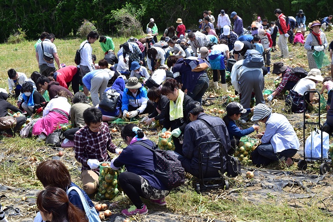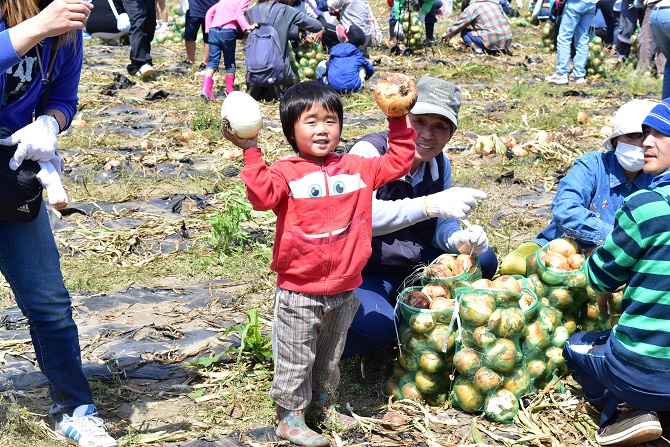 毎年大勢の来場者で賑わっている「白子玉ねぎ祭り」が15日に白子町で開催され、今年で16回目を迎えました。 今年は県民の日の開催ということもあり、長生地域の行事として各市町村のマスコットキャラクターも参加しました。そのほかにも、長生地域の特産品などが当たる抽選会を開き、会場には行列ができました。 掘り取り会場も大勢の人で賑わい、参加者はネットに掘り取った玉ねぎを詰め込んでいました。また会場には、「おいしい~」と言いながら玉ねぎにかじりつく子供もいるなど、玉ねぎ祭りは終始大盛況でした。
