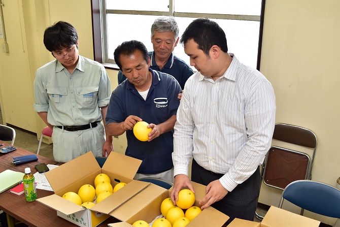剃金(そりがね)農事研究組合は25日、JA長生白子選果場で平成28年産キンショウメロンの査定会を開き、生産者、市場関係者、県長生農業事務所など12人が出席しました。長島久組合長は「消費者に喜んでもらえる品物を出荷するよう心掛け、組合一丸となって取り組んでいく」とあいさつしました。また市場関係者は「白子町のキンショウメロンは古くからのブランドであり、他産地より品質が良い。今後も選果選別の徹底と、出荷規格を厳守して出荷してほしい」と生産者へ呼びかけました。