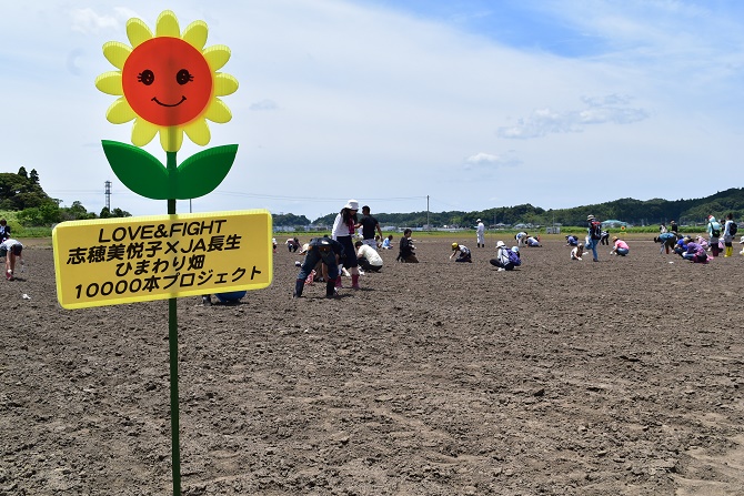 1万本のヒマワリを育てて被災地へ届ける「壮大!ひまわり畑1万本プロジェクト!」が6月4日、茂原市の圃場(ほじょう)で始まりました。JA長生と、フラワーアーティストの志穂美悦子さんが協力して開催。県内外から集まった家族連れなど100人以上が参加し、約7万粒の種をまきました。