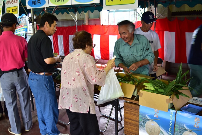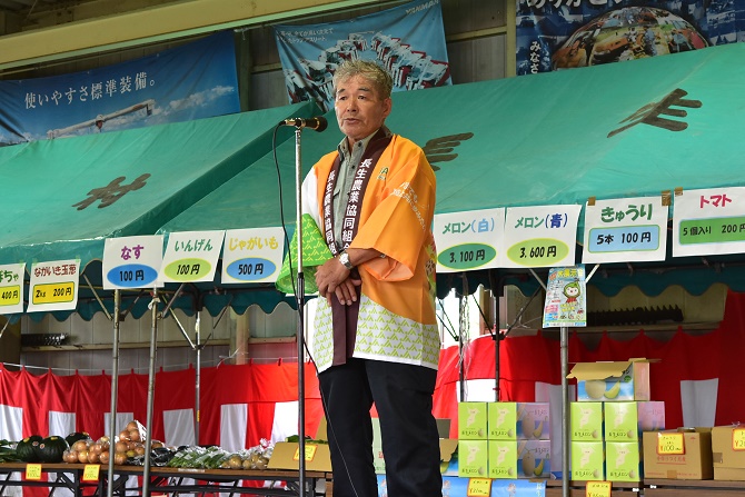 6月25日、長生地区ふれあい感謝祭を高根支所で開催しました。若干雨がぱらついていましたが、家族連れなどたくさんの来場者が訪れ賑わいました。 開催にあたり芝﨑絋一長生地区運営委員長は「住民と農協のふれあいを、今後とも大事にしていきたい」とあいさつしました。怒涛いなさ太鼓による迫力の演奏で開会し、感謝祭では長生マスクメロンなどの農産物販売、小型農機具の展示などがありました。また買い物をしてくれたお客様にはお米のすくい取り、泥ネギ購入者には皮むき機を使った皮むき体験が行われるなど、終始盛会でした。