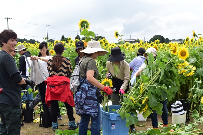 東日本大震災、熊本地震の被災地へ、元気や勇気を届けたいという思いで始まった「壮大!ひまわり畑10,000本プロジェクト」が7月31日に収穫を迎え、JA長生、志穂美悦子さん、一般参加者100名で、ヒマワリの収穫、調製作業などを行いました。