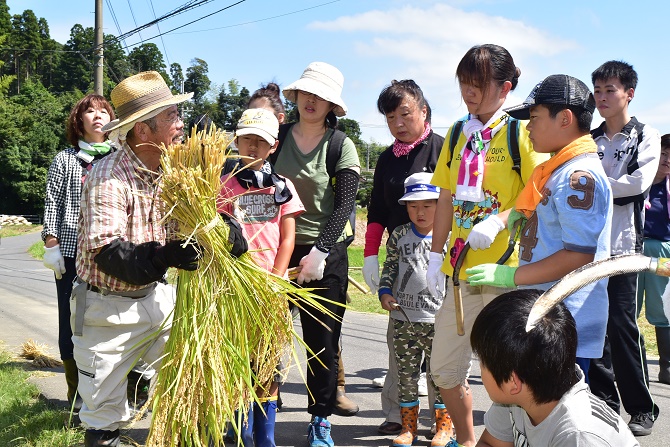 JA長生とユアサ・フナショク㈱、京成ストアは3日、茂原市の田んぼで稲刈り体験を開催しました。同地区で耕作放棄地の復元に取り組んでいる内海農園協力のもと、5月に田植えをした親子連れなど約50人が参加しました。