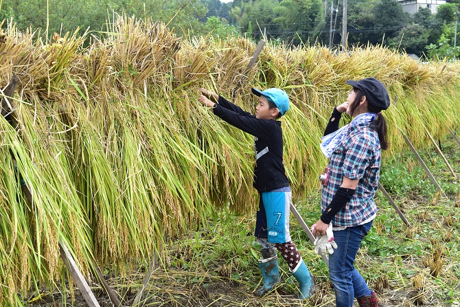 参加者は、鎌の使い方や稲を束ねる作業の説明を聞くと、成長した「コシヒカリ」を丁寧に刈り取りました。束ねた稲を今では珍しい「おだかけ」にも挑戦しました。稲刈りが終わると、JAの新米で握ったおにぎりや、オードブルをみんなで食べました。