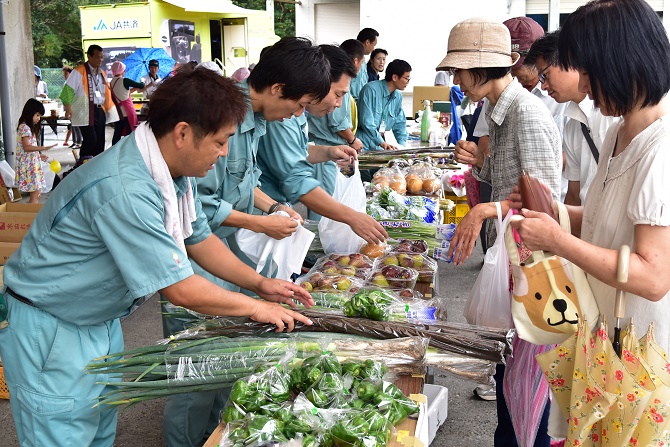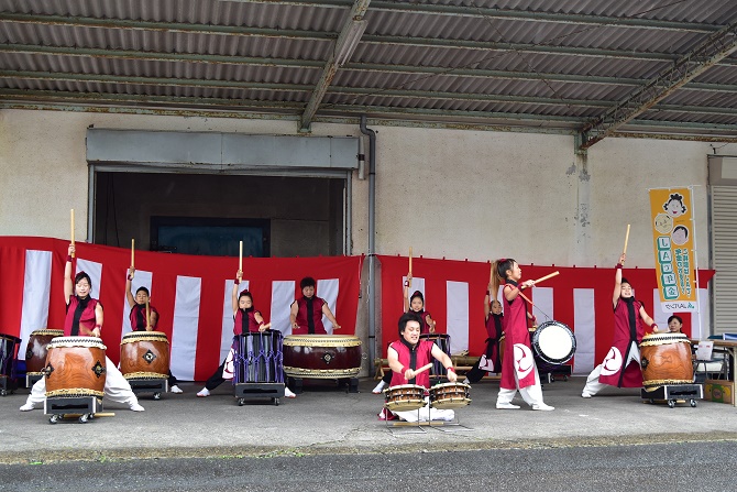 会場では地元の農産物や女性部が作った焼きそばなどの販売、綿菓子やつきたてのお餅の無料配布など、至る所に行列が出来ていました。青年部による輪投げやスーパーボールすくいコーナーには、子供たちが集まりゲームを楽しんていました。また、創作和太鼓集団、太鼓衆「楽」のみなさんは、迫力の演奏を披露してくれました。