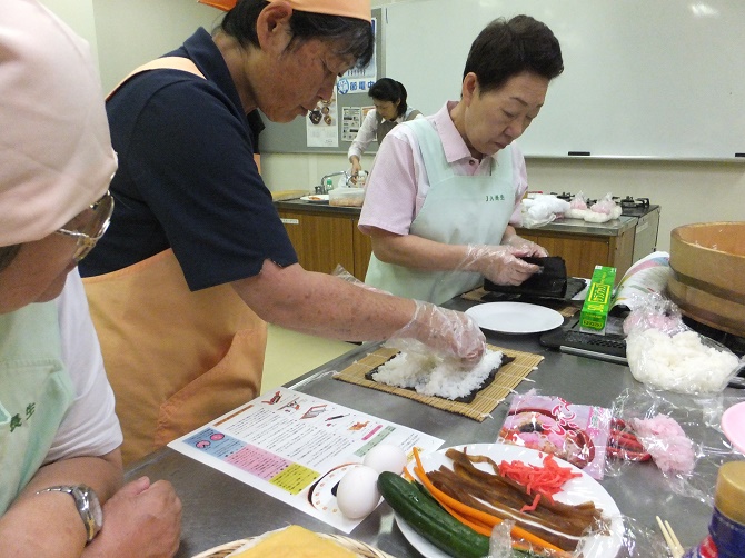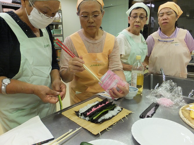 JA長生助けあい組織ながいきの会の会員たちは9月30日、五郷福祉センターで太巻き寿司作り講習会を開きました。会員相互の親睦を深めるために開催し、今回はバラ、カタツムリ、チューリップの太巻き寿司を完成させました。みなさん、綺麗においしく作ることが出来ました。