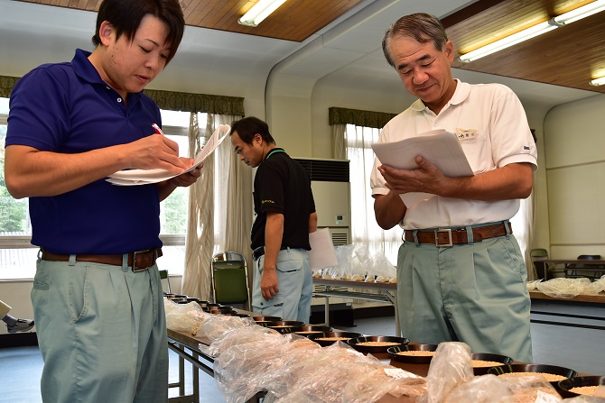 種子籾は発芽試験や、その後の検査に合格した者を出荷しますが、この下見会は発芽試験前の事前検査です。6人の検査員が「コシヒカリ」108点、「ふさおとめ」32点、「ふさのもち」10点の計150点を検査しました。検査員は「台風9号による倒伏の影響が心配されたが、うるち、もち共に品質の良いものが揃っていた。異種穀粒や異物の混入も見られず、現時点で問題はない」と講評しました。