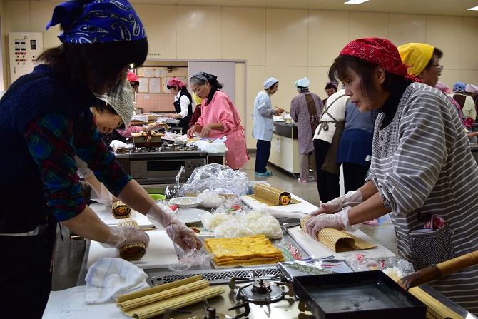 JA長生女性部短期大学校第8回講座が11月17日、白子町の健康づくりセンターで開催されました。 今回の内容は、女性部伝統の太巻き寿司作りです。女性部役員を講師に、受講生のみなさんは綺麗に「バラの花(のり巻き)」と「椿の花(卵巻き)」を完成させました。