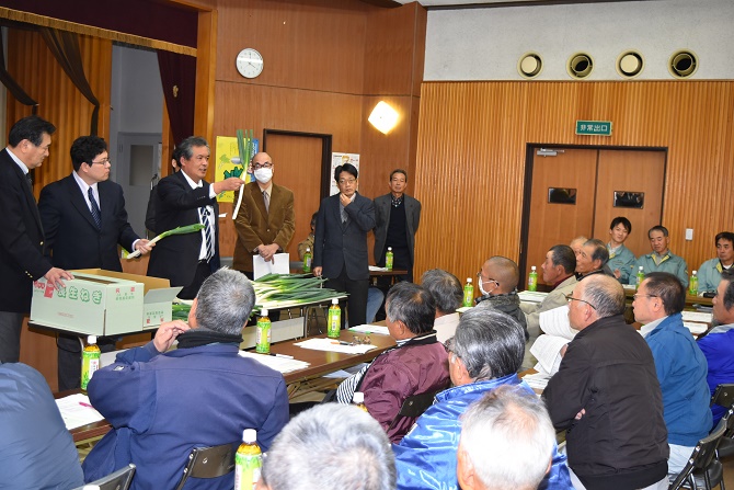 JA長生ねぎ協議会は11月25日、本納支所で秋冬・春ネギの査定会を開催し、生産者、長生農業事務所、JA全農ちば、市場関係者など約80人が出席しました。 販売方針や出荷計画などを確認したほか現品査定を行い、全農職員、市場関係者とともに、葉枚数、根切り、太さなど、規格や調整の注意点を確認しました。 協議会では販路の確保・拡大に向けて、販売促進活動、食育活動に取り組み消費者に直接そのおいしさをPRしていく方針です。4月までに20万3千ケース(1ケース5㌔)の出荷を計画しています。