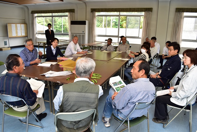 5月9日、長南町露地野菜出荷組合は、間もなく出荷を迎えるソラマメの査定会と作付品目検討会を開きました。生産者、長生農業事務所、行政、市場関係者、JA全農ちばなど23名が出席しました。
