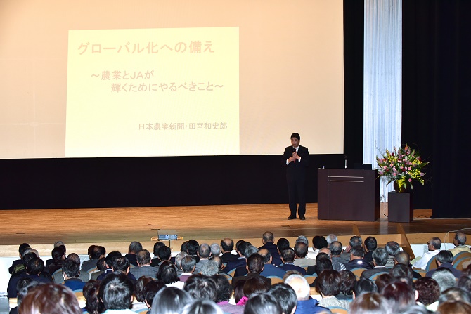 1人目の講師は、日本農業新聞の田宮和史郎論説委員室長です。「『グローバル化への備え』~農業とJAが輝くためにやるべきこと~」と題して、JAの担う役割として地域生産力の向上を図るとともに、地域農業の魅力を発信して次世代や地域の方々、組合員から一層目を向けてもらい、共に歩んでいくことが重要であると講演していただきました。