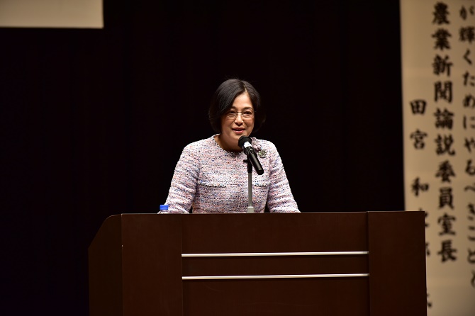 2人目の講師は「命を感じる暮らし」と題し、タレントの高木美保氏にご講演いただきました。自然に囲まれた暮らしに魅入られ、農業に取り組みながら生活する自身の体験を踏まえ、日本農業の素晴らしさ、農業を通じて得られた感動・人との繋がりから子育てに関することなどを語ってもらいました。