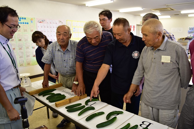 販売情勢報告、出荷留意点の確認、出荷標準品の査定、今後の栽培管理などについて協議。出荷標準品の査定では、生産者はサンプルのキュウリを手に取り、果形(肩張り、尻太、尻細等)、曲がり、着色などの規格を確認した。