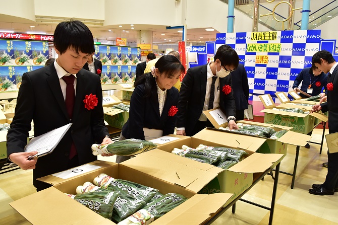 茂原ショッピングプラザアスモにて、第5回葉玉ねぎ品評会を開催しました。審査員は長生農業事務所、行政、JA全農ちば、市場関係者など11人です。