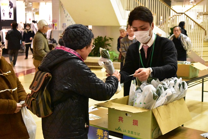 品評会終了後は、来場者先着100人への葉玉ねぎプレゼントと、葉玉ねぎを使ったぬたの試食を振る舞いました。試食した人からは「甘くておいしい」などの声をいただきました。