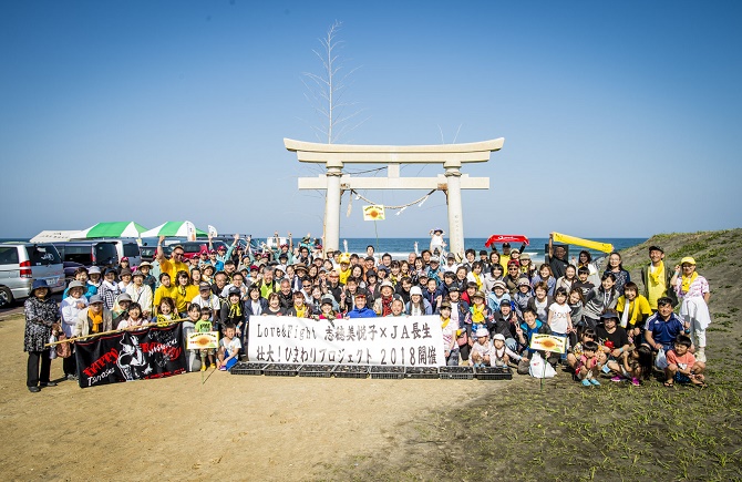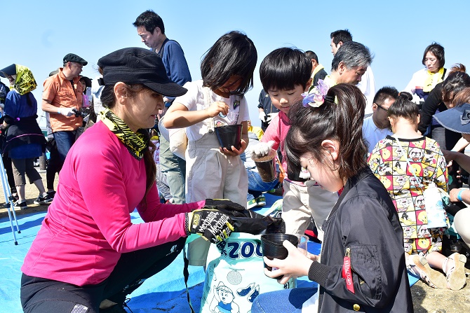 はじめに青山コーチの指導のもと、砂浜をウォーキングし、正しいストレッチを学びました。気持ちのいいストレッチであっという間の1時間が過ぎ、続いて海岸の厳かな鳥居の下で、ひまわりの種をポットに蒔きました。