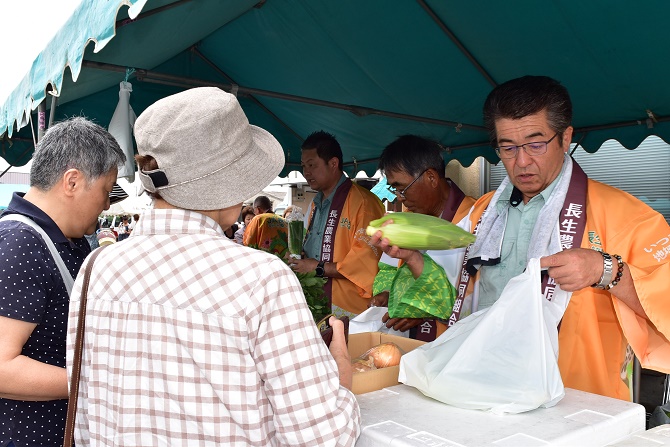 今年3月に発足した、長生地区女性部も出店。焼きそばなどを販売し、来場者に好評でした。また、農産物の販売では、長生ブランドのマスクメロン・トマト・タマネギの他、新鮮なトウモロコシなどが店頭に並び、行列となりました。