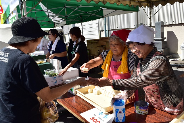 賑わう会場では、女性部が炊き立ての新米で握ったおにぎりの試食コーナーを設け、長蛇の列となったほか、長生トマトやながいき梨などの、新鮮な地元農産物を買い求める方も多く、購入者には、米のすくいどりやお楽しみ抽選会なども実施され、会場は終始盛会でした。