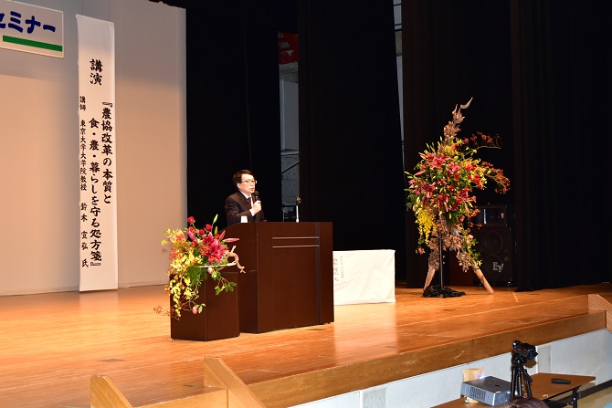 第1部では、東京大学大学院教授鈴木宣弘さんを講師に招き、「農協改革の本質と食・農・暮らしを守る処方箋」と題して講演。