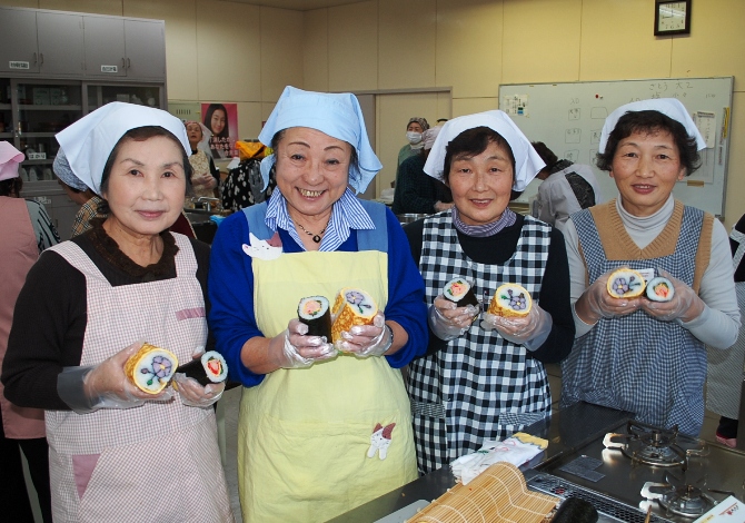 今回は「さざんかとばら」 の2種類に挑戦しました。女性部役員の吉野さんを講師にして、巻き方の手順の指導を受けました。巻きあがったお寿司を切った時は、「オー」と皆さんから大きな歓声が上がりました。