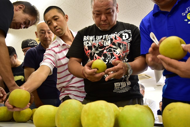 22日、2019年産ながいき梨「幸水」の査定会をJAグリーンウェーブ長生で開きました。生産者、農業事務所、JA全農ちば、わかしお共済組合、市場関係者ら約90人が出席。 本年産は、7月の曇天・気温低下等により例年より、やや生育が遅れたが、作柄は順調で病害虫の発生も少なく、糖度も十分。贈答品としても申し分ない素晴らしい仕上がりです。幸水は、8月中旬までに4万5千㌜(1㌜10㌔)の出荷を計画しています。