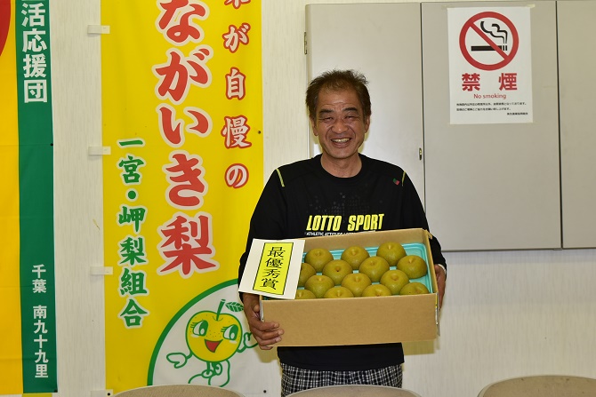 「幸水」が最盛期を迎える中、JA長生はグリーンウェーブ長生において幸水の共進会を開催しました。 審査員は夷隅・長生農業事務所、行政、JA全農ちば、市場関係者等7人で、一宮・岬梨組合の生産者により27点が出品されました。1次審査では、形・玉ぞろい等の外観を審査し上位9点を選出、2次審査では実際に切って糖度や食味を審査しました。 厳正な審査の結果、一宮町の土屋篤さんが最優秀賞に輝き、審査員からは「全体的に技術が高く、甲乙のつけがたい審査だった」と講評しました。