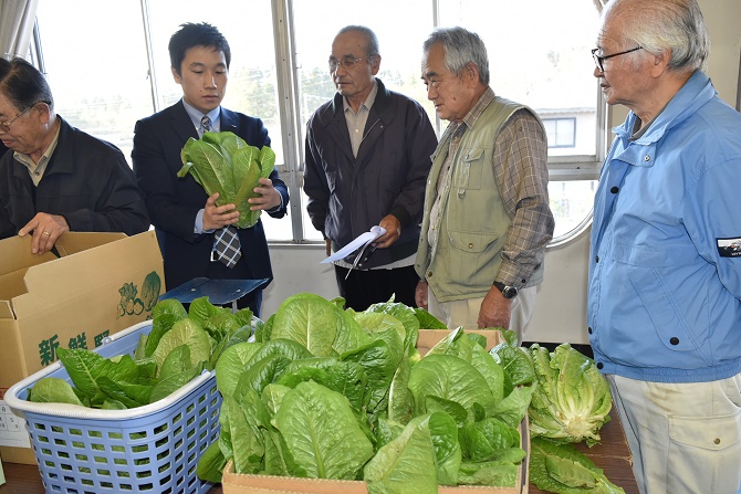 長南町露地野菜出荷組合は12日、長南支所においてブロッコリー・ロメインレタスの査定会を開き、組合員、県長生農業事務所、JA全農ちば、市場関係者ら14人出席のもと、情勢や販売方針、出荷留意点について協議しました。 現品査定では、準備したブロッコリーやロメインレタスを組合員が直接、市場関係者に確認しながら規格に分け、調整や箱詰め作業の注意点について申し合わせました。 市場関係者は「安定した出荷と数量の情報共有を行い、有利販売に努めていきたい」と組合員へ呼びかけました。