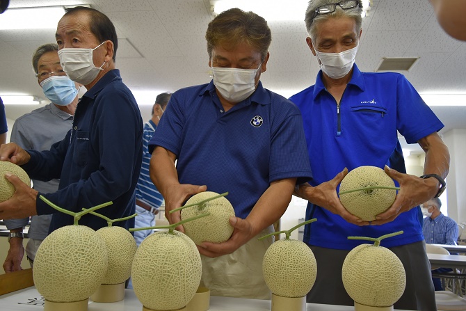 18日、JA長生施設野菜部会アールスメロン部はグリーンウェーブ長生において令和2年産アールスメロンの査定会を開き、生産者、市場関係者、JA役職員ら約30人が参加しました。 本年産は、気温が高く日照時間を多く確保できたことから生育良好で、玉の大きさ、糖度は充分。 贈答品やお中元にもぴったりです。また、ご家庭でもぜひご賞味ください。