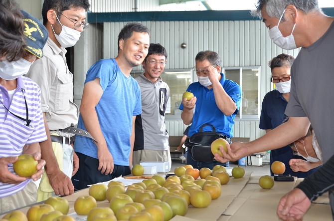 29日、JAグリーンウェーブ長生にて露地栽培で育った幸水の目揃え会を行いました。 目揃え会では、同組合販売部が中心となり、用意した梨を「秀・優・良・規格外」に分け、出荷規格の確認や出荷時の注意点を説明しました。組合員は、梨を手に取り、念入りに確認した他、糖度計を使って現在の糖度を計測しました。 これから、梅雨が明け、気温が上がると梨の出荷量も増えてきます。この梨は、JA直売所「ながいき市場」や「一宮店」で購入できますので、ぜひお越しください。