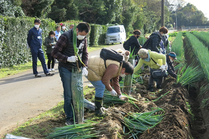 長生農業独立支援センター協議会は、農業に関心・興味を持っている方を対象に、長生農業バスツアーを開き、県内外から12組16名の方が参加しました。 参加者・主催者ともに健康チェックと感染症対策を十分に行った後、一宮町の梨農家、白子町のトマト農家、長生村のネギ農家を見学し、ネギの収穫体験を行った他、グリーンウェーブ長生のトマト選果場やネギ出荷調製施設などの管内施設の見学や利用方法などの説明を受けました。また、先輩就農者の体験発表や意見交換を行い、無事に終了しました。
