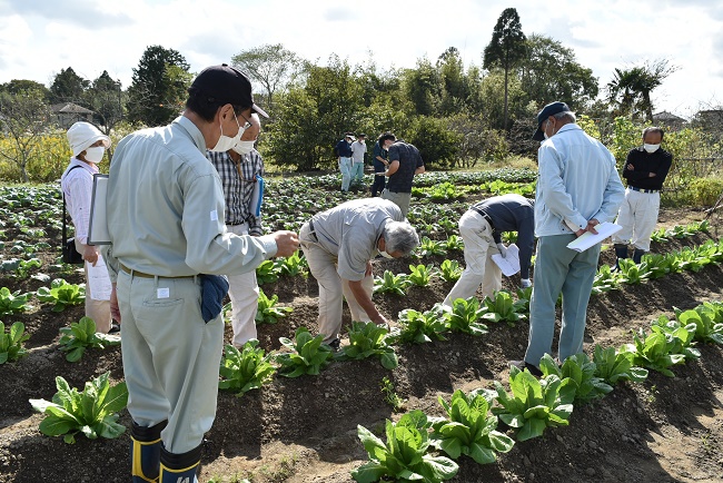 長南町露地野菜出荷組合は15日、生産者、長生農業事務所、行政、JA職員が参加のもと、長南町にあるブロッコリーとロメインレタスを栽培している8圃場を巡回。生育状況や病害虫等の有無について確認を行いました。 巡回時には、農業事務所やJA担当者が定植時期や使用している肥料・農薬について、一人ひとり確認しながら、今後の栽培管理について指導。病害虫対策や台風後の管理についての注意点の話がありました。