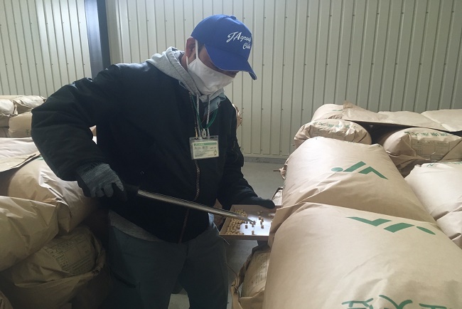 農事組合法人長南町東部営農組合は、8日に大豆初検査を行いました。 収穫した840袋の水分、重量、粒の大きさ、品質など6項目について検査を行い、いずれも良質でした。 今年からドローンによる空中散布での防除を行い、圃場の管理を徹底していました。 大豆は、ながいき市場にて販売中です。