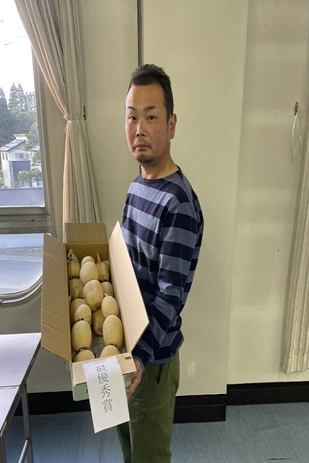 長南支所においてレンコンの共進会を開き、長南町蓮根組合から9点の出品があり、量目、形状、揃い等を審査しました。 厳正な審査の結果、最優秀賞に浅生英雄さんのレンコンが選ばれました。 また、共進会終了後に目揃え会を開き、入念に出荷規格を確認しました。