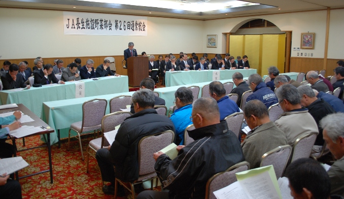 JA長生施設野菜部会は3月4日、一宮町のホテル一宮館で「第26回通常総会」を開催しました。部員、行政、わかしお農業組合ら150人が出席しました。 河野豊部会長は挨拶で「今年のトマトの売上はまずまずだった。新規部会員の加入や若手生産者の規模拡大などがあった。これからも部会一丸となって活動していきたい」と話しました。 総会では、片岡茂氏を議長に選出し、2議案すべて承認しました。部会では、生産力の強化・供給力をしっかりと強化することを申し合わせました。