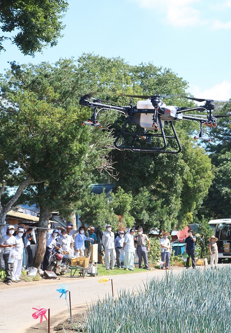 本納蔬菜部研究会は26日、農業事務所、ドローン業者、メーカー、全農ちば、JA職員ら参加のもと、秋冬ネギにおける農薬ドローン散布実演を行いました。 農薬やドローンの説明を受け、ドローンによる散布実演が行われました。 参加者からは、散布にかかる時間の速さに驚きの声が上がっていました。