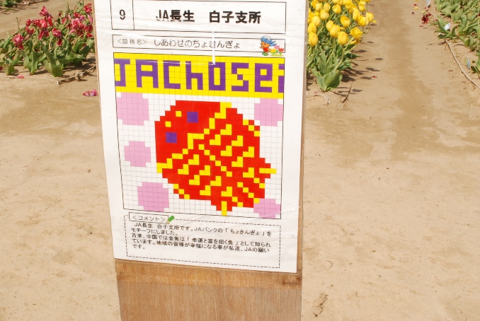 JA長生白子支所は白子町で行われる「白子チューリップまつり」の団体模様植えコンテストに出場しました。JAバンクの「ちょきんぎょ」をモチーフにしました。赤や黄色、白などの色鮮やかなチューリップが咲きましたが、どうみてもきんぎょには見えないのです。(笑)