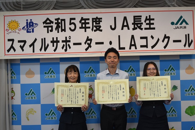 このコンクールは、ロールプレイング形式で商品の熟知度や提案話法などを競い合いました。厳正な審査の結果、スマイルサポーター部門で睦沢支所の関屋栞担当、LA部門で長南支所の美濃川雅係長がそれぞれ最優秀賞を受賞しました。