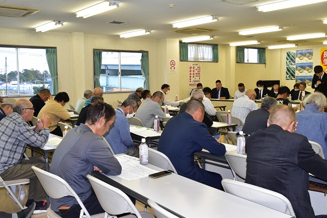 一宮・岬梨組合は、グリーンウェーブ長生にて令和5年産「ながいき梨」生産・出荷反省会を開催し、生産者、JA全農ちば、長生・夷隅農業事務所、農業共済組合、市場関係者、JA役職員ら約50名が参加しました。組合員の表彰では、大玉・小玉比率、秀優率、平均糖度の高さ4項目の合計点数にて選出された一宮町の小高義也さんが、幸水の部で最優秀賞に輝きました。